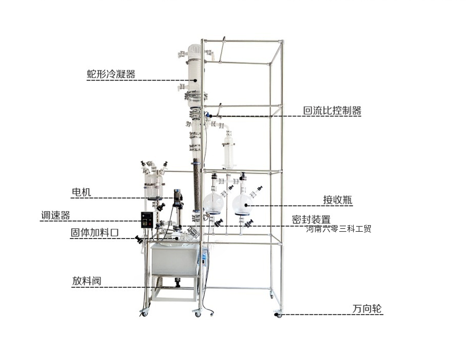 用途特点中试规模的溶剂高效回收●防爆等级为ExdⅡBT4●不锈钢框架,外观优美,耐腐蚀性强●3.3高硼硅玻璃原料的高硼硅玻璃釜体,耐腐蚀性强,应用范围广;釜体透明,便于关注反应过程●塔顶设卧式冷凝器,冷凝面积大,效率高●玻璃管路采用法兰连接,便于拆装,且整机密闭性更好●采用负压原理进料,操作安全方便●可通过阀门控制冷凝液