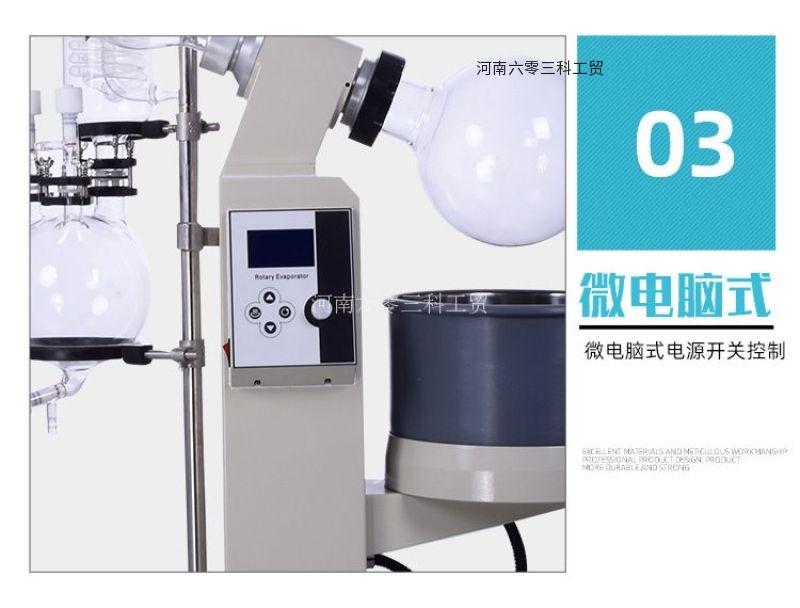工作原理:蒸发瓶恒速旋转,水浴锅恒温加热,在此条件下:物料在蒸发瓶内壁形成大面积均匀薄膜快速蒸发,在真空条件下可以提高蒸发效率(需连接真空装置),溶媒蒸汽经玻璃冷凝盘管时冷却成液体(需连接冷却装置),回收于收集瓶。