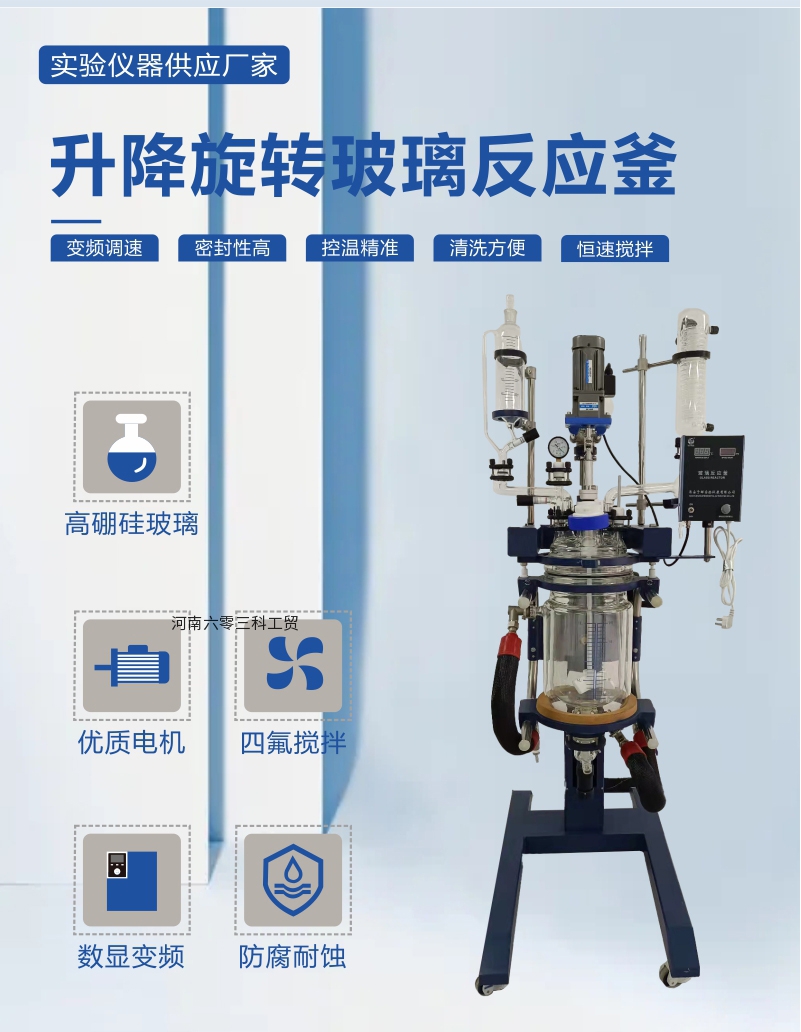 功能特点:•反应釜釜体采用高硼硅玻璃(3.3高硼硅玻璃原料),有优良的物理化学性能,瓶体透明、可见反应液料。•主体采用不锈钢框架+铝合金材质,美观坚固耐腐蚀。•不锈钢搅拌棒外包四氟,适用于多种溶剂搅拌,无污染耐腐蚀。•搅拌电机、升降电机均采用低速增力电机,运转平稳、力矩大、无火花、寿命长。•聚四氟乙烯组件+机械密封、专有技术、可保证良好的真空度且使用寿命长。•本产品调速器为转速、温度双数显。转速可通过调速旋扭设定,直观方便;另配有釜内温度测温探头(PT100)(可显示釜内物料温度)。•整体结构紧凑合理,设有带刹车万向轮,可整体移动,操作方便。•无死角玻璃斜放料阀门,可有效减少搅拌死角,放料方便。•本产品设有真空显示功能,对高沸点物料可以选择最佳工作真空度