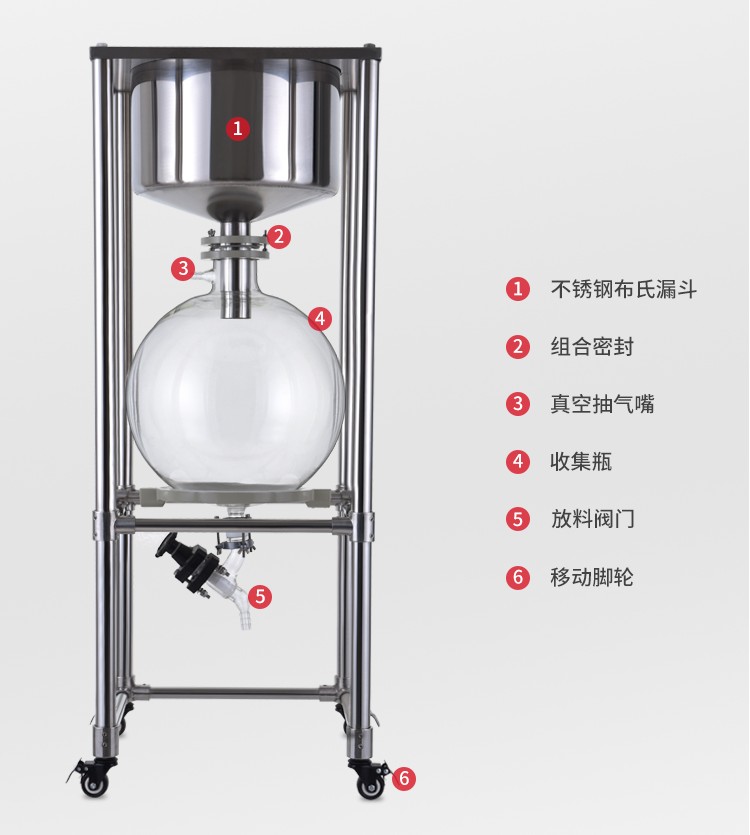 产品介绍:本机的不锈钢漏斗配以不同的过滤材料后(滤布、滤网、滤膜等,需客户自备),将需要过滤的物料均匀放于过滤层上;玻璃抽滤瓶外接真空泵,利用负压原理,对漏斗内物料进行过滤,过滤后的物料被抽入抽滤瓶中,具体过滤后的物料标准取决于所使用的滤布规格。本机可用于固液分离、物料干燥、液体去杂质等操作