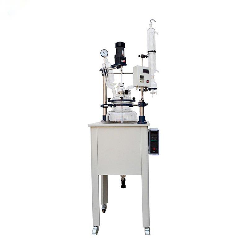 单层玻璃反应釜内层放置反应溶媒可做搅拌反应,夹层通过冷热源(冷冻液、水、导热油)循环,